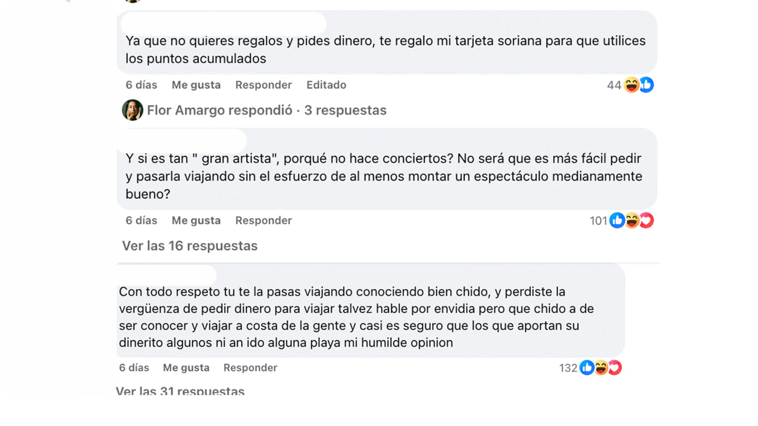 La reacción del público ante la publicación de Flor Amargo se dividió en dos posturas claras. Por un lado, algunos seguidores mostraron apoyo y comprensión, argumentando que financiar una gira es un desafío. Por otro lado, muchas personas la criticaron por pedir dinero en lugar de recibir obsequios tradicionales, lo que generó una ola de comentarios negativos en redes sociales.