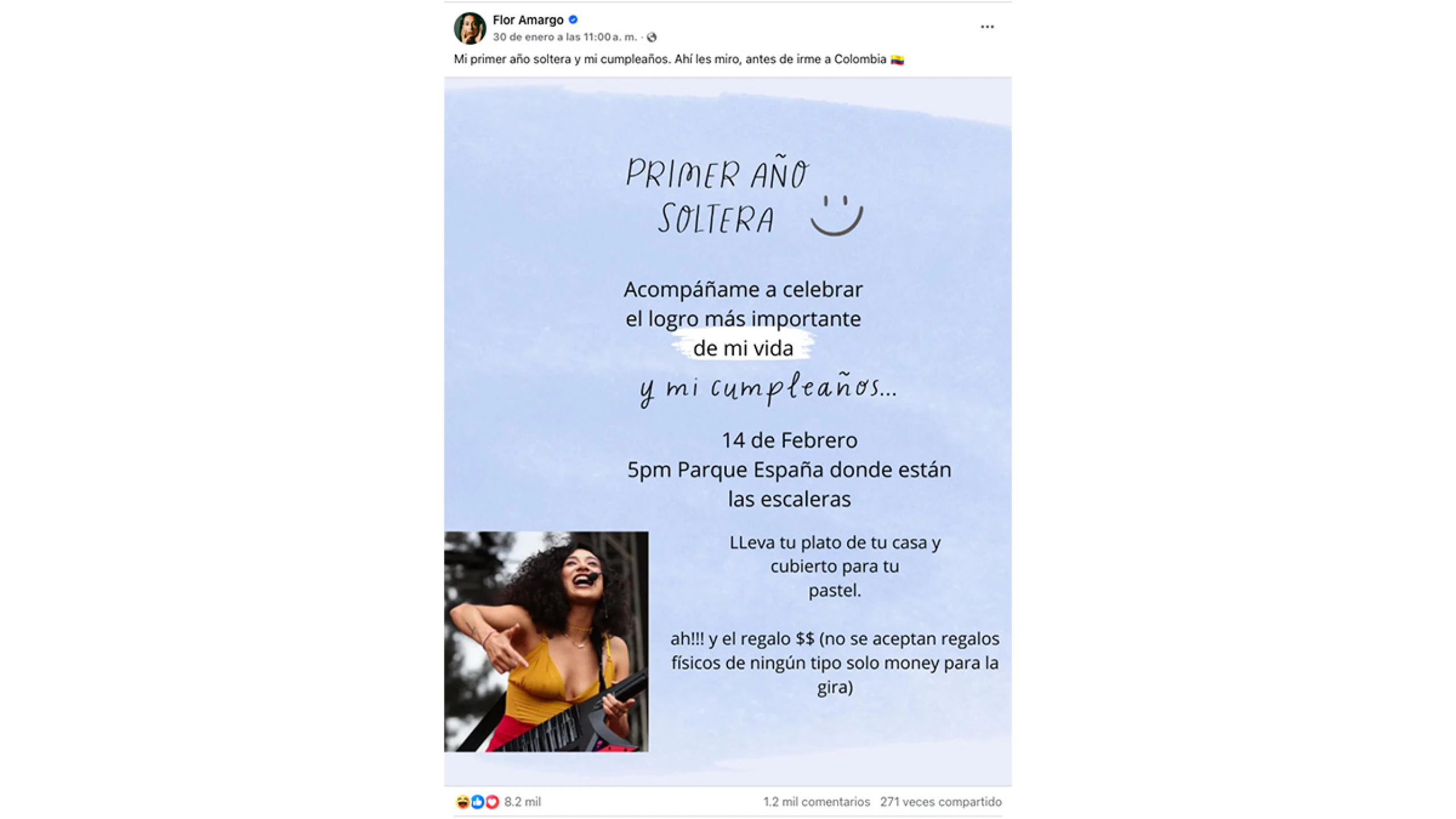 “Primer año soltera. Acompáñame a celebrar el logro más importante de mi vida y mi cumpleaños. 14 de febrero, 5 pm, Parque España, donde están las escaleras. Lleva tu plato y tu cubierto para tu pastel… y el regalo $$ (no se aceptan regalos físicos de ningún tipo, solo money para la gira)”, escribió la cantante en su publicación.
